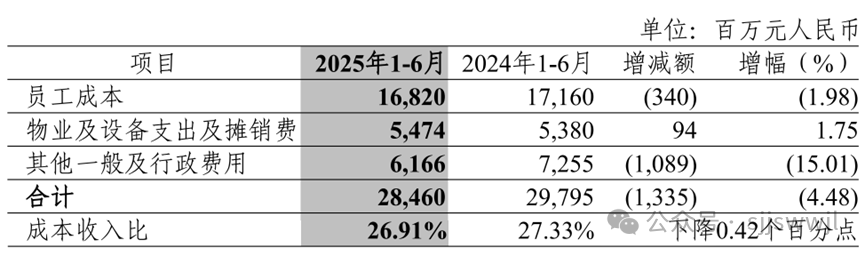 上半年,中信银行业务及管理费用284.60亿元,同比减少13.35亿元,下降4.48%;成本收入比为26.91%,同比下降0.42个百分点。